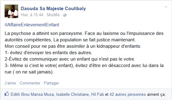 La folie prend de l’ampleur ces derniers jours du mois de janvier 2015. Ici on apprend qu’on attrape de plus en plus de coupeurs de tête. Ces suspects qui sont attrapés avec des enfants qui ne sont pas les leurs et qui se font littéralement bastonner et traiter d’assassins. Il ne fait pas bon de se balader avec son fils en pleurs ces temps-ci à Abidjan.